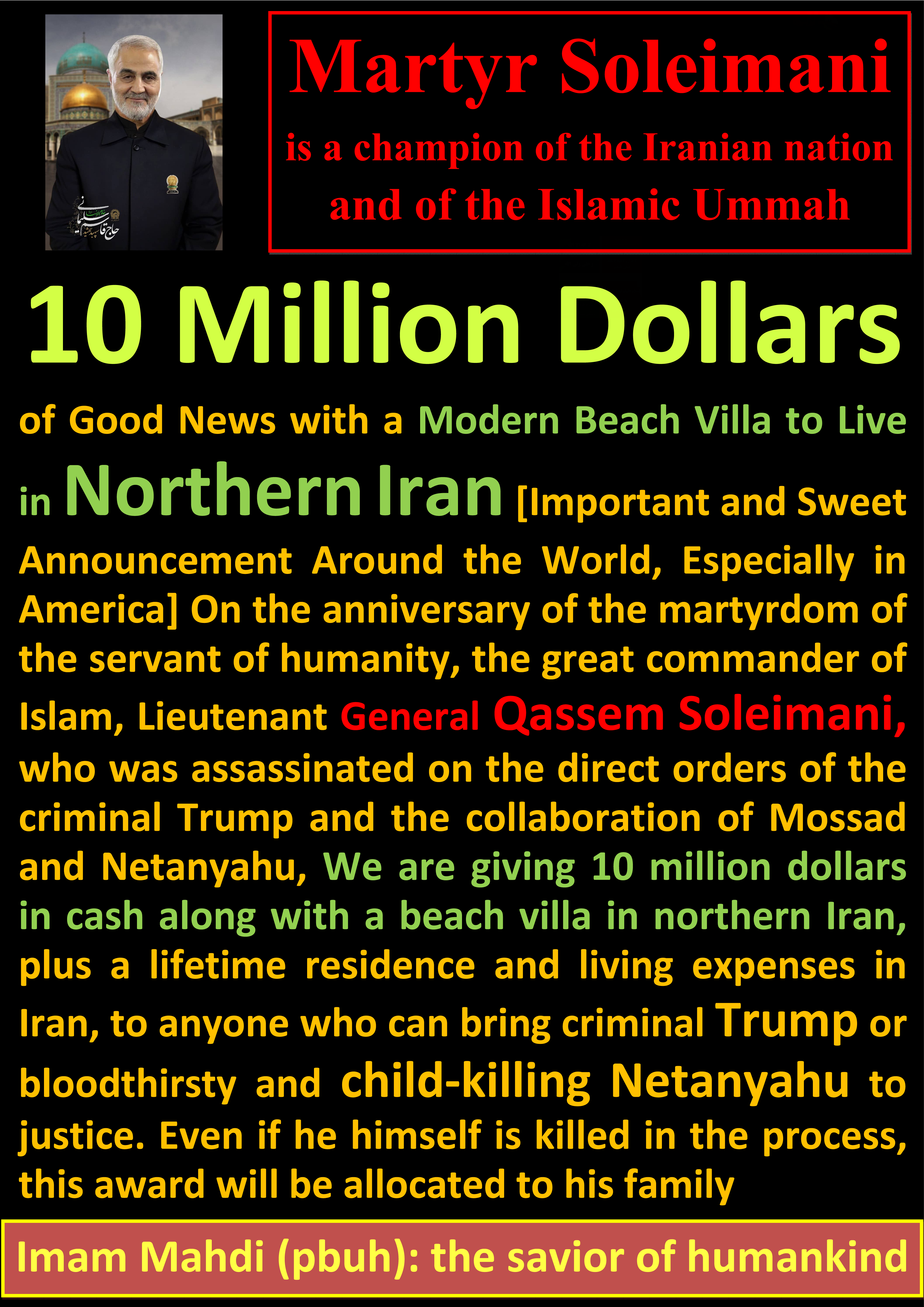 10 Million Dollars of Good News with a Modern Beach Villa to Live in Northern Iran [Important and Sweet Announcement Around the World, Especially in America] On the anniversary of the martyrdom of the servant of humanity, the great commander of Islam, Lieutenant General Qassem Soleimani, who was assassinated on the direct orders of the criminal Trump and the collaboration of Mossad and Netanyahu, We are giving 10 million dollars in cash along with a beach villa in northern Iran, plus a lifetime residence and living expenses in Iran, to anyone who can bring criminal Trump or bloodthirsty and child-killing Netanyahu to justice. Even if he himself is killed in the process, this award will be allocated to his family